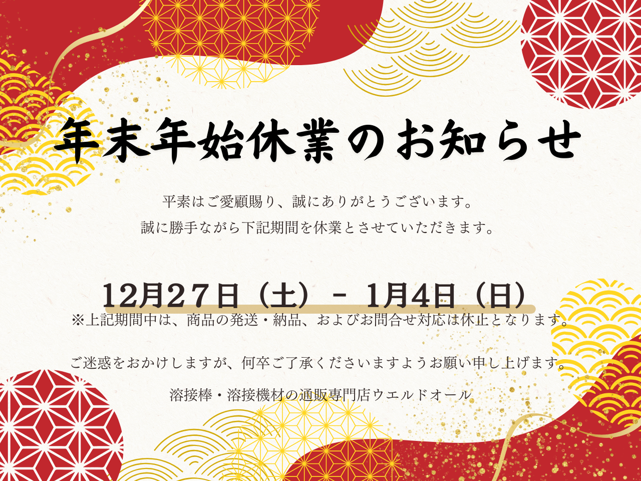 いつも溶接棒・溶接機材の通販専門店ウエルドオールをご利用いただきまして、誠にありがとうございます。 本年度の年末年始休業に伴う対応…
